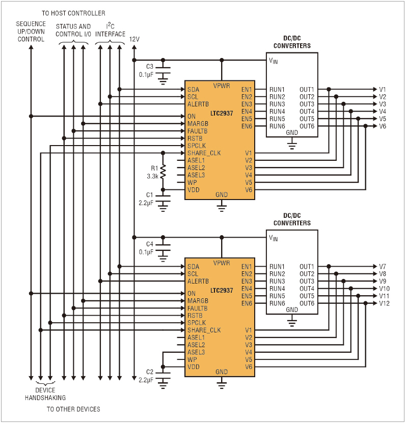 또한 EEPROM을 통합함으로써 이 IC가 전적으로 자율적으로 동작할 수 있으며 시스템을 제어하기에 적절한 상태로 파워업 할 수 있다. 또한 다중의 LTC2937이 협력적으로 동작해서 단일 와이어 통신 버스를 통해 시스템 내의 최대 300개 전원을 자율적으로 시퀀싱 할 수 있다.