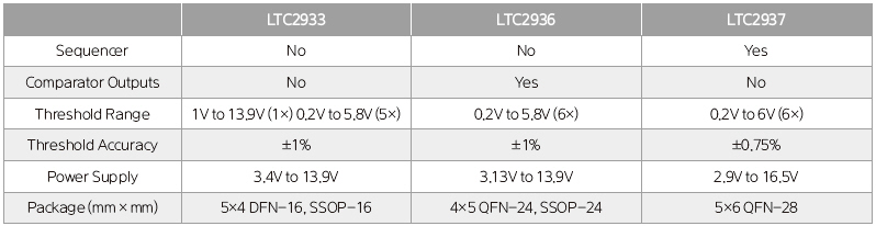 리니어 테크놀로지의 LTC2937이 바로 그러한 제품이다. LTC2937은 EEPROM을 통합한 6채널 전압 시퀀싱 및 감시 IC이다. 6개 채널 각각으로 2개의 전용 비교기를 사용해서 과전압 및 저전압 조건을 φ0.75% 이내로 정확하게 모니터링한다. 비교기 임계값은 8비트 분해능을 사용해서 0.2V~6V로 개별 프로그램 할 수 있다. 이들 비교기는 빠르며, 글리치(glitch)를 일으키지 않으면서 전달 지연이 10?s이다. 각 시퀀싱 채널이 인에이블(enable) 출력을 사용해서 외부 레귤레이터나 통과 FET 게이트를 제어할 수 있다. 업 시퀀싱 및 다운 시퀀싱 순서, 시퀀싱 타이밍 파라미터, 결함 응답을 비롯해서 감시기 전압 및 시퀀서 타이밍에 관련된 모든 측면을 개별적으로 구성 가능하다.