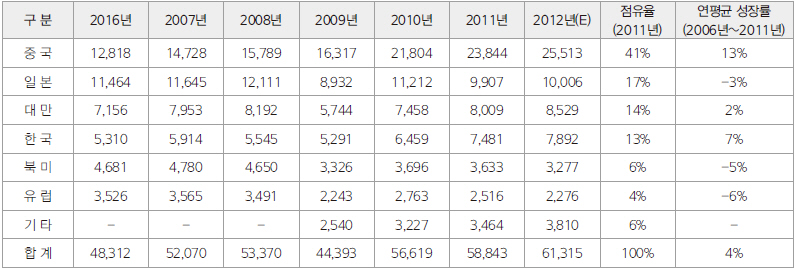 ▲ 표 2. 연도별/국가별 세계 인쇄전자회로기판 시장 규모 (단위: 백만 달러)