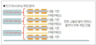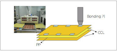 이에 반해 bonding 방식은 rivet이나 pin 등의 물리적 고정 장치를 사용하지 않음으로써, 가이드의 물리적 압축으로 인한 불량이 없음. 다만 전체 인쇄전자회로기판을 쌓은 후 압착(press) 하기 전 층 간 뒤틀림 등을 방지하기 위해 인쇄전자회로기판 가장 자리의 국소 부위 부분만을 선택적으로 선행 bonding 하는 공정이 필요하며, 이를 가접 본딩이라고 한다. 가접 본딩은 가열된 막대팁을 통해 열을 특정 부위에 전달하여 접착하는 기술이며, 이러한 기술 특성상, 다층 인쇄전자회로기판을 제작할 경우 열전달 효율 문제로 인해 쌓을 수 있는 인쇄전자회로기판의 층수가 제한된다는 단점이 있다(그림 6).