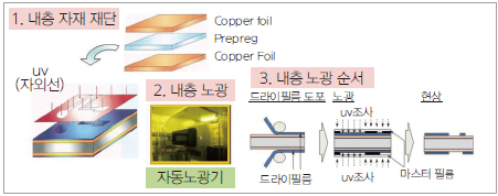 기존 4층 인쇄전자회로기판 제작의 경우, 양면으로 회로 형성된 인쇄전자회로기판기판을 단순 접합하는 mass lamination 기법을 통해 손쉽게 가능하였다(그림 3).