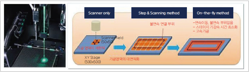 또한 필요할 경우, 단순 스캐너 방식이 아닌, stepping 방식을 도입하여 대면적화가 가능하며, 연속이동 방법 적용시 고속가공이 가능한 장점이 있다. 다만, 현 포토리소그래피의 값싼 공정 비용을 고려할 때, 대면적으로 고속가공하는 레이저의 비용은 상대적으로 비싸지는 단점이 있다. 따라서 기존 값싼 공정과 융합 가능한 신규 기술의 개발이 필요하다(그림 9).