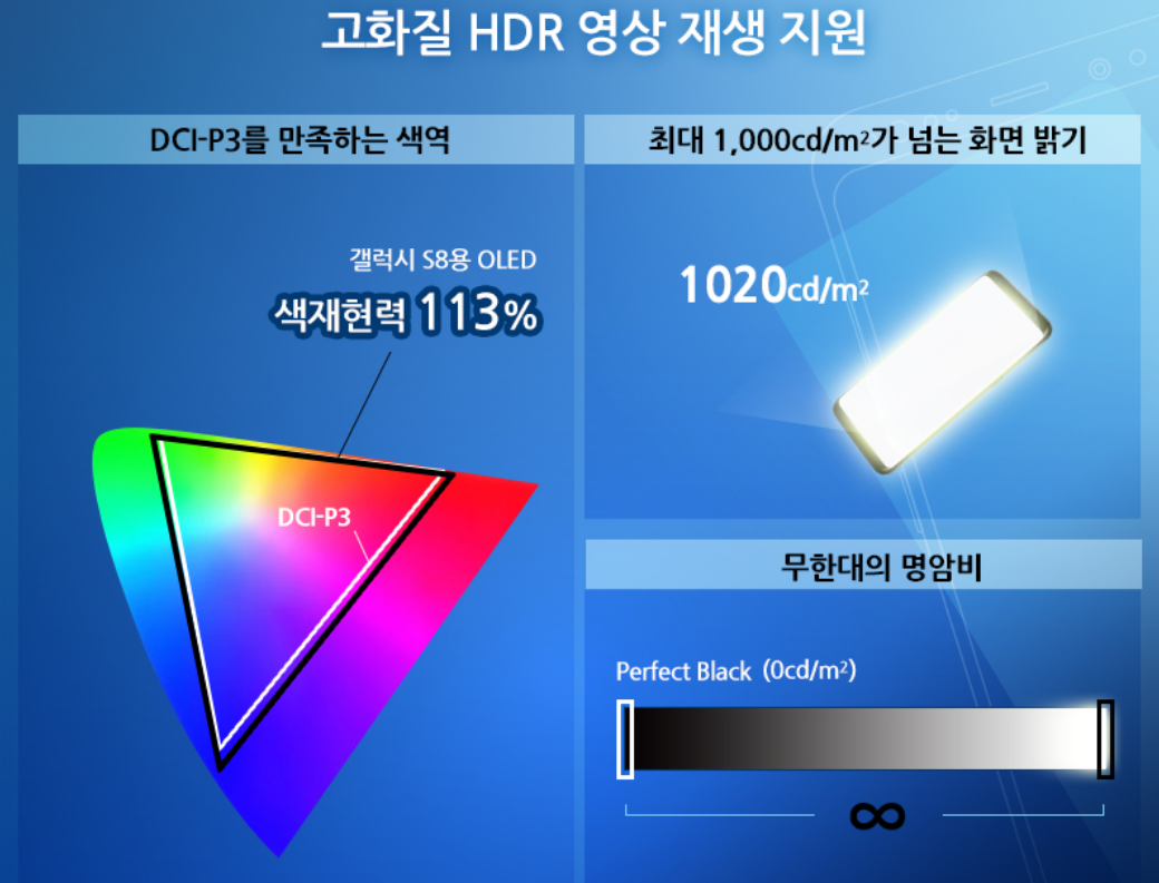 HDR(High Dynamic Range)은 고화질 영상 기술로, 색을 풍부하게 표현하고 영상의 밝고 어두운 부분을 더욱 세밀하게 표현해 화질을 높이는 최신 기술이다. 갤럭시S8은 고휘도(최소 540cd/㎡), 고색재현력(DCI-P3 90% 이상), 고해상도 등 '모바일HDR프리미엄'이 요구하는 기준을 모두 충족시켰다는 것이 회사측 설명이다.