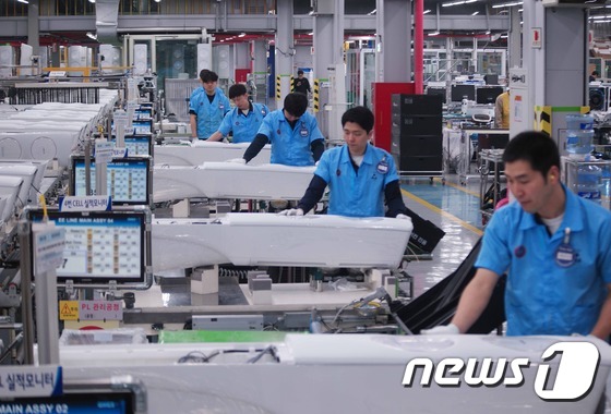 삼성전자 직원들이 지난 18일 광주 오선동 광주사업장 에어컨 생산라인에서 '삼성 무풍에어컨'을 조립하고 있다.(삼성전자 제공)