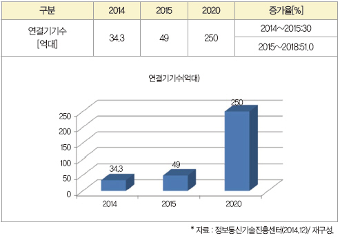 IoT 네트워크에 연결 가능한 기기 수는 2014년 34억 3,000만 대에서 2015년에는 전년 대비 30% 증가한 49억 대, 2020년에는 2015년 대비 51% 증가한 250억 대로 폭발적인 증가를 예상하고 있다.[3][4] 2014~2020년 동안 IoT 네트워크에 연결 가능한 기기 수를 <표 1>에 나타낸다.