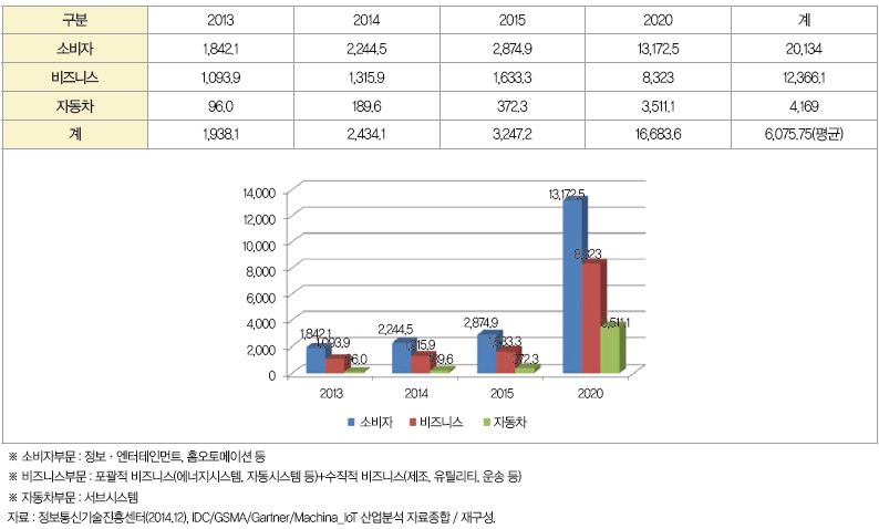 2020년 기준, 부문별(소비자/비즈니스/자동차) IoT기기 사용 전망은 소비자 부문이 가장 많은 131억 7,250만 대로 전체의 79%를 차지할 것으로 예상된다. 2013~2020년까지 누적 총 201억3,400만 대의 사용이 예상된다[3][4][5]. 각 부문별 IoT기기 사용 전망치를 <표 2>에 나타낸다.