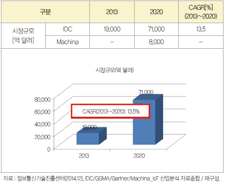- IDC는 2013년 1조9,000억 달러에서 연평균 13.5% 성장을 지속하여 2020년에는 7조 1,000억 달러에 이를 것으로 전망하고 있다.