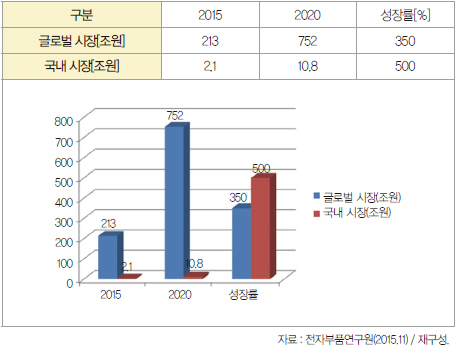 IoT 플랫폼 관련 글로벌 시장규모는 2015년 약 213조 원에서 2020년에는 약 752조 원으로 3.5배 성장할 것으로 예상된다. 국내 시장규모는 2015년 약 2조 1,000억 원에서 2020년에는 약 10조 8,000억 원으로 5배 성장할 것으로 예상된다[1]. 2015~2020년 동안 국내외 IoT 플랫폼 관련 시장규모 전망치를 <표 4>에 나타낸다.