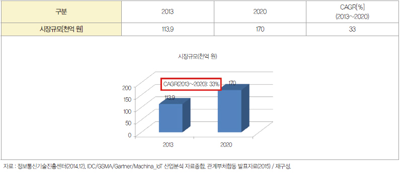 IoT 전후방 기술 관련 국내 시장규모는 2013년 11조 3,900억 원에서 연평균 33% 성장을 지속하여 2020년에는 약 17조 원에 이를 것으로 전망하고 있다[3][4][6].