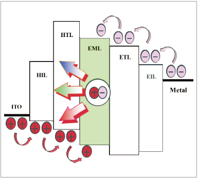 산화반응이 일어나는 전극인 애노드(anode)와 전자가 방출되는 전극인 캐소드(cathode) 사이에 유기물질을 얇게 입히고, 양 전극에 전계를 걸어 정공과 전자가 전극으로부터 주입되어 발광층(EML)에서 발광하게 되는 것이 OLED발광의 메커니즘이다. 정공주입층(HIL)과 정공수송층(HTL)은 각 전극으로부터 유기물로의 정공주입을 원활하게 하고 발광층(EML)으로의 정공 전달을 효과적으로 할 수 있는 물질을 사용하며, 전자주입층(EIL)과 전자수송층(ETL)은 효과적으로 전자의 주입과 전달을 할 수 있는 물질을 사용한다. 이렇게 전달된 정공과 전자가 발광층(EML) 내에서 재결합하며, 여기서 생성된 엑시톤(exciton)이 빛의 형태를 띄며 소멸되는 것을 이미션(emission)이라고 한다.