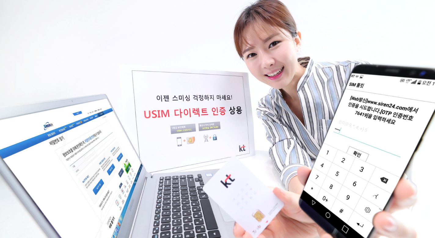 KT(회장 황창규)는 통신사 만의 안전한 보안 채널과 스미싱 우려가 없는 1등급 보안매체인 USIM을 결합해 SMS인증처럼 간편하면서도 안전한 ‘USIM 다이렉트 인증’을 상용화한다고 16일 밝혔다.