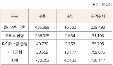 품목별로는 185.3% 증가한 기타 금형을 제외하고 모든 품목이 전년 동기 대비 하락한 것으로 조사됐으며, 플라스틱 금형은 1,653만 달러, 프레스 금형은 966만 달러, 다이캐스팅 금형은 276만 달러를 기록했다. 신흥국 판로 다변화가 관건으로 우리나라 금형산업은 그 동안 수출 확대를 통해 성장을 지속해 왔다.