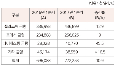 최근 우리나라 금형산업은 장기 경기 침체가 지속되는 가운데 미국의 금리 인상과 보호무역주의 확산, 중국의 경기 제재 조치 등으로 대외 리스크가 커지며 어려움이 날로 더해가고 있다. 국내 주요 경제 연구기관들이 올 초 한국의 성장 전망을 2%를 겨우 웃돌 것으로 전망하며 올해 경제 역시 난항을 겪을 것으로 예상하고 있다. 이러한 가운데 올해 1분기 금형 수출은 전년대비 10.9% 증가하여 순조로운 출발을 보였다.