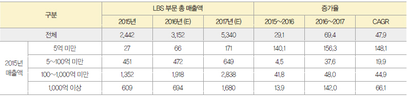 ▲ 표 1. 2015년 총 매출액별 LBS 부문 매출액 (단위 : 억원, %)
