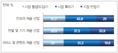사업자 대부분이 국내 LBS 시장이 확대기에 있다고 응답하면서, 국내 산업을 긍정적으로 전망했다. 서비스 및 콘텐츠 제공 산업(51.3%), 인프라 제공 산업(43.8%), 단 말 및 기기 제공 산업(37.5%)순으로 시장 확대기에 있다고 응답했다(그림 2) .