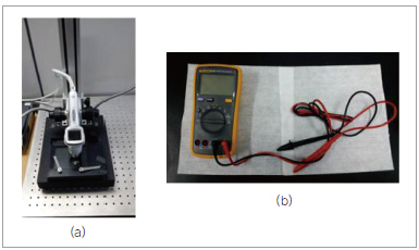 제조한 샘플은 광학현미경(SOMETECH)을 이용해 회로의 선폭을 측정했고Multimeter(FLUKE, 15B+)를 통해 비저항을 측정했다. (사진 1)