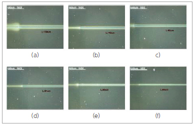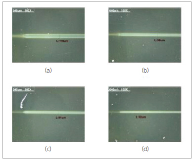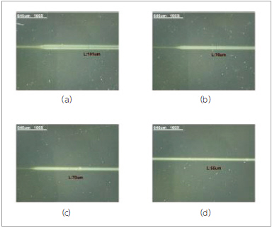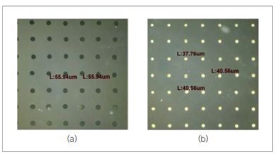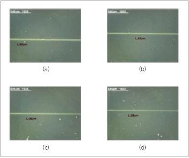 회로의 폭을 비교하였을 때도 Fluorocarbon 코팅하지 않은 기판의 경우 76.92μm로 본 과제의 목표인 50μm이하의 선폭을 나타내지 못한 반면 Fluorocarbon 코팅한 기판의 경우 39.16μm로 과제의 목표를 달성할 수 있었다.