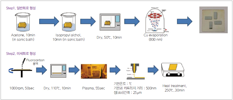 회로를 구현하기 전 기판은 Acetone과 Isopropyl alchol을 sonic bath(HWA SHIN, Power sonic 405)를 이용해 각각 10분씩 세척했다. 세척 후에는 dry oven에 50 ℃ 온도로 10분간 건조를 실시했고 증착기(Woosung, WGV 1500EV)를 이용해 800nm의 두께로 일반회로를 증착했다. 증착기를 이용해 일반회로 형성을 끝낸 기판은 ink-jet프린터로 미세회로를 형성했다. ink-jet 프린터로 프린팅을 하기 전 전처리를 했고 기판에 Fluorocarbon용액을 스핀코터(MIDAS)를 이용해 코팅했다.