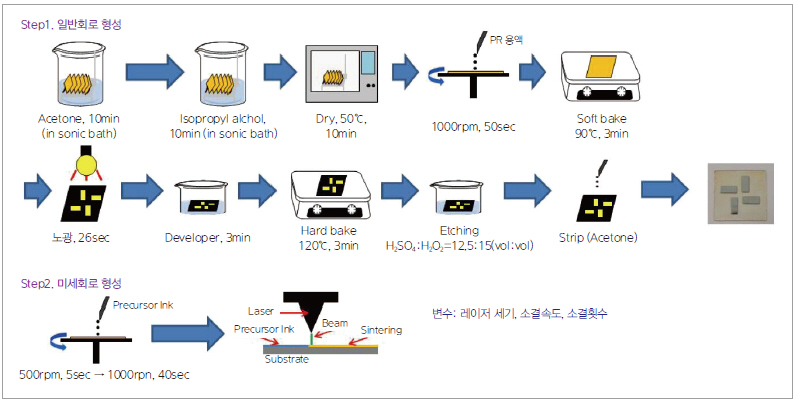 미세회로 형성 공정은 Ag precursor ink를 스핀코터로 기판위에 코팅하고 레이저를 이용해 회로를 소결했다. 스핀코터는 500rpm으로 5초동안 one-step 코팅 후 1,000 rpm으로 40초 동안 two-step으로 코팅했다. 레이저의 경우 레이저의 세기, 속도, 횟수에 변수를 두어 실험을 진행했다.