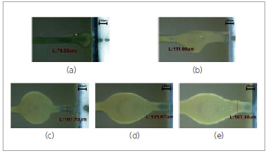 또한 1회의 경우 점의 크기와 회로폭의 차이가 약 20μm로 심한 차이를 보였으며 회로의 폭을 증가시켰을 때 회로의 폭은 각각 76.92μm, 111.9μm, 107.7μm, 125.87μm, 167.84μm로 일정하게 증가되지 않아 원하는 폭의 회로를 형성할 수 없었다.