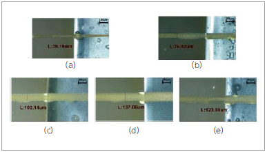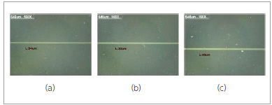 반면 Fluorocarbon 코팅한 기판의 경우 코팅하지 않은 기판과는 달리 Ag잉크가 뭉침, 쏠림 현상이 없었고 일반회로 위에 소결 및 연결이 되어있음을 확인 할 수 있었다. 또한 점의 크기와 1회 회로의 폭을 비교하였을 때도 거의 차이가 없었으며 회로의 폭을 증가시켰을 때도 Fluorocarbon 코팅하지 않은 기판보다 일정한 크기로 증가 됨(39.16μm, 76.92μm, 102.14μm, 137.06μm, 123.08μm)을 확인 할 수 있었다.