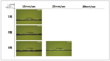 이는 소결횟수를 늘리면 laser와 접촉한 기판의 온도가 계속해서 증가하고 laser와 접촉한 기판을 중심으로 열이 서서히 퍼지면서 소결이 되는 것으로 추측된다. 사진 6은 Laser 전력이 0.4W일 때 소결횟수, 소결속도에 대한 광학현미경 사진으로 Laser 전력이 0.4W의 경우 소결속도 30mm/sec, 소결횟수 1회를 제외하고 모든 조건에서 소결됐음을 확인 할 수 있다. Laser 전력이 0.2W일 때보다 빠른시간 안에 기판에 열을 전달해 주었기 때문으로 판단된다.