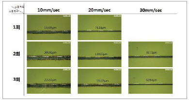 ▲ 사진 12. Laser 전력이 0.1 Watt일 때 소결횟수에 대한 선폭 변화