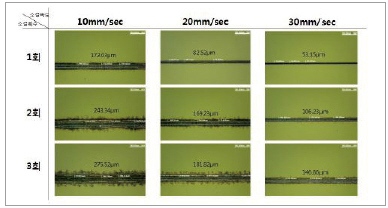 0.2W와 마찬가지로 소결횟수와 회로폭은 비례했으며 소결속도가 빠를수록 기판에 전달되는 열이 적기 때문에 회로폭이 작아지는 것을 확인 할 수 있다. Laser 전력이 0.6W일 때는 모든 조건에서 소결이 일어났으며 역시 회로폭은 소결횟수에 비례, 소결속도에 반비례했다.(사진 7)