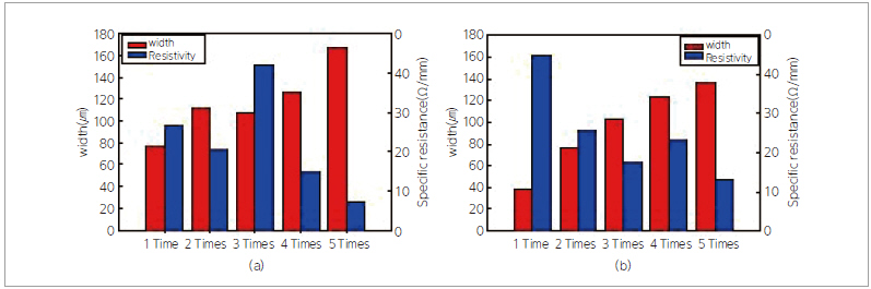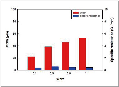 ▲ 그림 11. Laser 전력이 0.1 Watt일 때 소결횟수에 대한 선폭 및 비저항