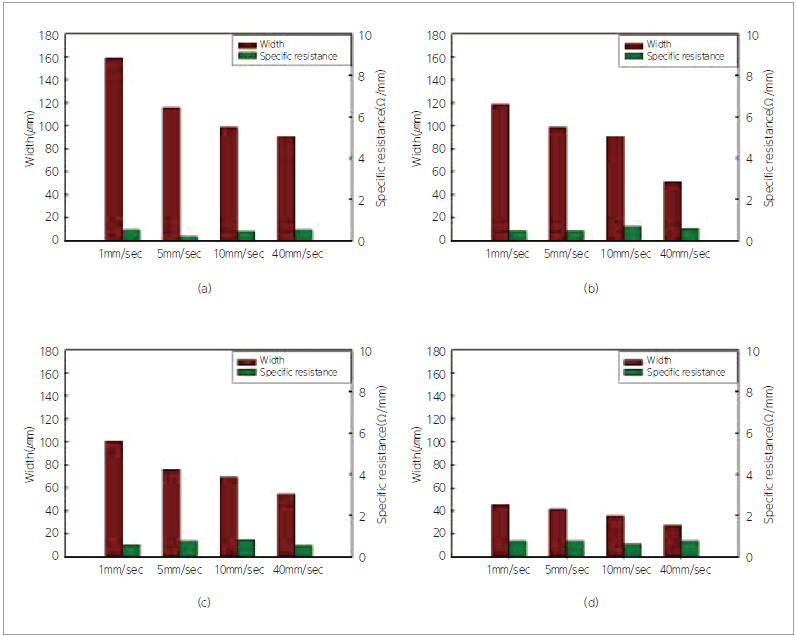 사진 9에 laser 전력이 0.5W일 때 소결속도에 따른 회로 변화를 나타냈다. 소결속도가 1mm/sec, 5mm/sec, 10mm/sec, 40mm/sec로 증가함에 따라 회로폭은 각각 119μm, 99μm, 91μm, 52μm로 감소하는 경향을 나타냈으며 laser 전력이 1W와 비교를 했을 때 각각 40μm, 17μm, 8μm, 28μm로 더 좁은 선폭을 나타냈다. 이는 1W보다 낮은 전력으로 인한 열발생이 적어 소결회로 외부분에 열전달이 상대적으로 적기 때문이며 laser 전력을 더 낮춘다면 더 좁은 회로를 형성할 수 있을 것으로 예상된다. 0.5W보다 낮은 0.3W의 laser 전력을 사용해 실험을 진행했다.