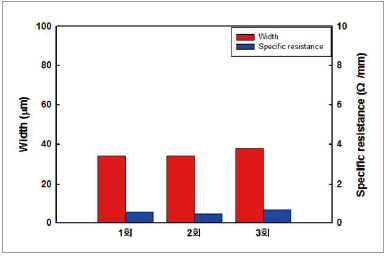 ▲ 그림 10. 소결조건별 회로 폭 및 비저항