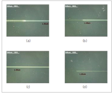 사진 10은 0.3W일 때 소결속도에 따른 회로변화를 나타낸 사진으로, 역시 소결속도가 증가함에 따라 101μm, 76μm, 70μm, 55μm로 회로폭이 감소하는 경향을 나타냈으며 0.5W보다도 회로폭이 감소하는 것을 확인 할 수 있었다.