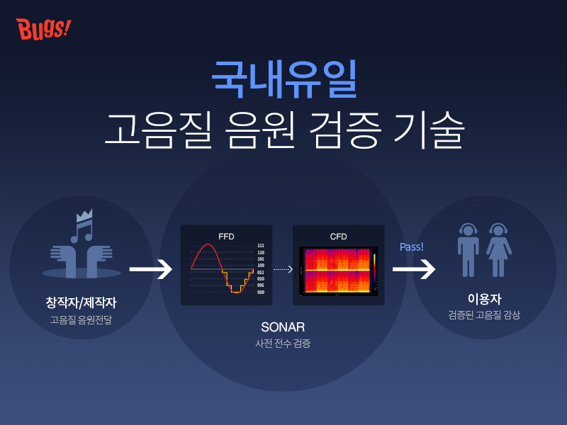 앞으로 벅스는 창작자 및 기획사로부터 받은 FLAC(Free Lossless Audio Codec) 고음질 음원을 검수하는 프로세스에, ‘SONAR’로 우선 검증하는 단계를 추가한다. ▲‘SONAR’를 통해 걸러진 의심되는 음원은 담당 부서에서 별도 검토하며, ▲필요할 경우 창작자의 재확인을 거쳐 서비스할 방침이다. 현재 총 1천만곡에 달하는 고음질 보유 음원도 이번에 개발된 ‘SONAR’로 전수 재검증 한다.
