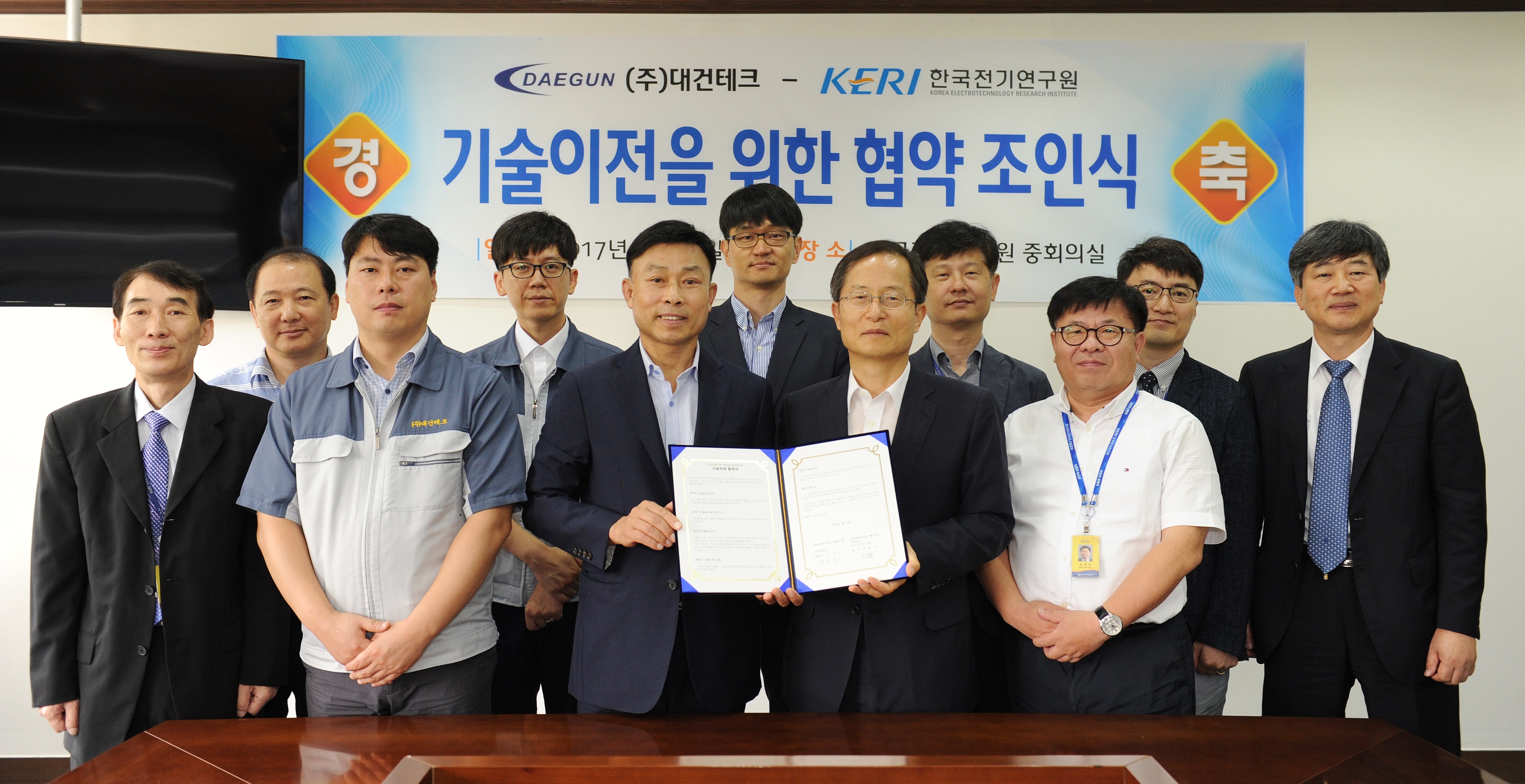 전기전문 출연연구기관 한국전기연구원(KERIㆍ원장 박경엽)과 창원산단 내 전자부품 제조업체인 대건테크(대표 신기수)는 최근 한국전기연구원 창원 본원에서 박경엽 한국전기연구원 원장, 신기수 대건테크 대표 등 양측 임직원이 참석한 가운데, ‘3D 나노 전자잉크 및 잉크 기반 고정밀 3D 프린팅 기술’ 관련 기술이전 조인식을 가졌다. 이를 통해 전자소자를 인쇄할 수 있는 고정밀 3D 프린터의 조기 상용화를 통한 신(新)시장 선점에 나선다는 계획이다.