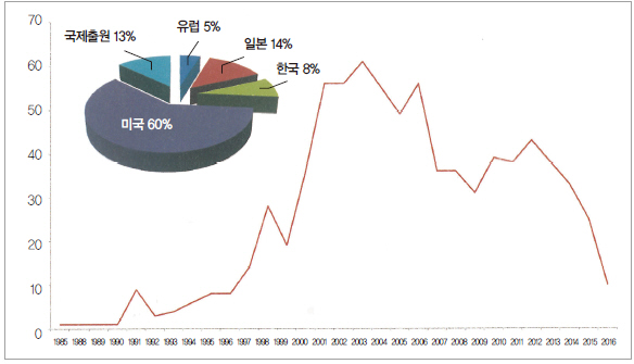 ▲ 그림 1. 공정 모델 분야 출원 특허의 국가별 점율률 및 연도별 추이 (*출처: 국가기술표준원)