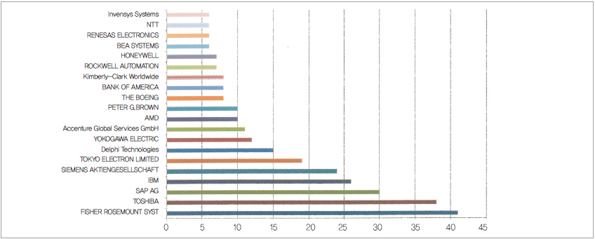 한국 기업은 20위에 한 개도 존재하지 않으며, 대부분이 미국과 유럽의 기업이고 일부분 일본의 기업들이 랭크되어 있다. 또한, 각국에 출원된 상위 30위의 기업들의 출원량을 보면, 유럽에서는 지멘스가 가장 많은 출원 활동(9개)을 하고 있으며, 일본과 한국에서는 도시바(17개, 6개), 미국에서는 FISHER ROSEMOUNT SYST INC(27개)와 SAP AG(27개), 그리고 국제특허는 FISHER ROSEMOUNT SYST INC(6개)가 가장 활발한 특허 활동을 하고 있는 것으로 나타났다. 전체적으로 모든 기업이 미국에서는 출원 활동을 하고 있는 것으로 나타났다. 이는 미국 시장이 가장 활발하다는 뜻으로 풀이된다.