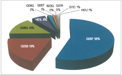 그림 3은 추출된 801건의 특허를 IPC별로 나타낸 것이다. IPC란 International Patent Classification의 약자로서 국제특허분류를 말한다. IPC 코드 분류는 A세션부터 H세션까지 8개의 세션으로 구분되어 있으며 각 특허문헌의 검색 및 R&D를 위해 참고용으로 많이 이용되는 분류표이다. IPC 중에서 공정 모델 분야는 주로 G세션과 H세션으로 국한되어 있다. G06F와 같은 서브클래스별로는 총 26개의 서브클래스가 공정 모델 분야의 기술에 해당되는데, 그중에서도 G06F(56%)가 압도적으로 많은 점유율을 보였다. G05B(19%), G06Q(14%)가 그 뒤를 따르고 있으며, 이 3개의 서브클래스 IPC가 전체에서 90%에 육박하는 것으로, 공정 모델 분야의 기술 분야는 G세션에 집중되는 것으로 판단된다.