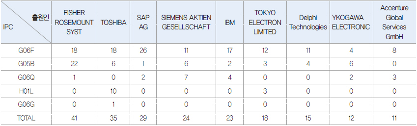 주요 출원인별 특허출원 현황을 보면, 미국의 FISHER ROSEMOUNT SYST INC(41건)와 일본의 TOSHIBA(38건), 독일의 SAP AG(30건), 미국의 IBM(26건), 독일의 SIEMENS(24건) 순으로 활발한 출원 활동을 하는 것으로 나타났다.