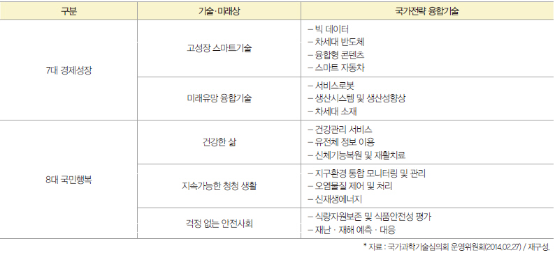 국가과학기술기본계획의 120개 국가전략기술 및 국가중점과학기술 전략로드맵(2014년 4월)의 30개 대상기술 중 추진과제 이행에 필요한 융합기술을 도출하였다. 이를 기반으로 경제적·사회적 가치 등을 평가하고 경제성장과 국민행복을 구현하는 데 기여할 수 있는 15대 국가전략과 5대 핵심 융합기술을 선정하여 추진하고 있다[3]. (표 1 참조)