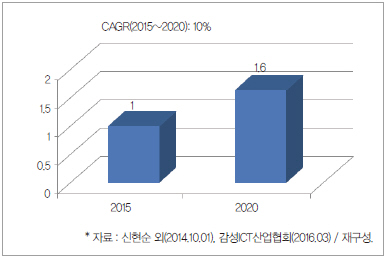 ICT 기술력을 이용한 감성인식 기술개발이 다양한 기술 분야에서 빠르게 확산되고 있다 6). 감성-ICT 융합기술 관련 글로벌 시장규모는 2015년 9,000억 달러에서 연평균 10%의 높은 성장을 지속하여 2020년에는 1조4,000억 달러의 대규모 시장형성을 예상하고 있다. 국내 시장규모는 2015년 24조 원에서 2020년에는 38조 원 규모로 성장할 것으로 예상하고 있다 7),[7][8]. 2015~2020년 사이 감성인식기술의 시장성장 추이를 그림 1-1과 그림 1-2에 나타낸다.