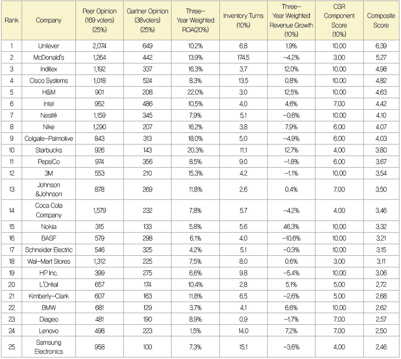 시장조사기관인 가트너(Gartner)는 매년 공급망 리더를 발굴하고 모범 사례를 공유하는 Supply Chain Top 25를 발표한다. 올해로 13번째 맞이하는 Supply Chain Top 25 순위에서 유니레버가 작년에 이어 2년 연속 1위를 차지했다. 유니레버에 이어 맥도날드와 인디텍스(Inditex), 시스코(Cisco) 및 H&M이 2위부터 5위에 랭크됐다. 노키아(Nokia)가 7년 만에 다시 순위안에 들었으며, 디아지오(Diageo)가 처음으로 랭킹 안에 포함됐다. 국내 기업으로는 삼성전자가 유일하게 25위에 올랐다.