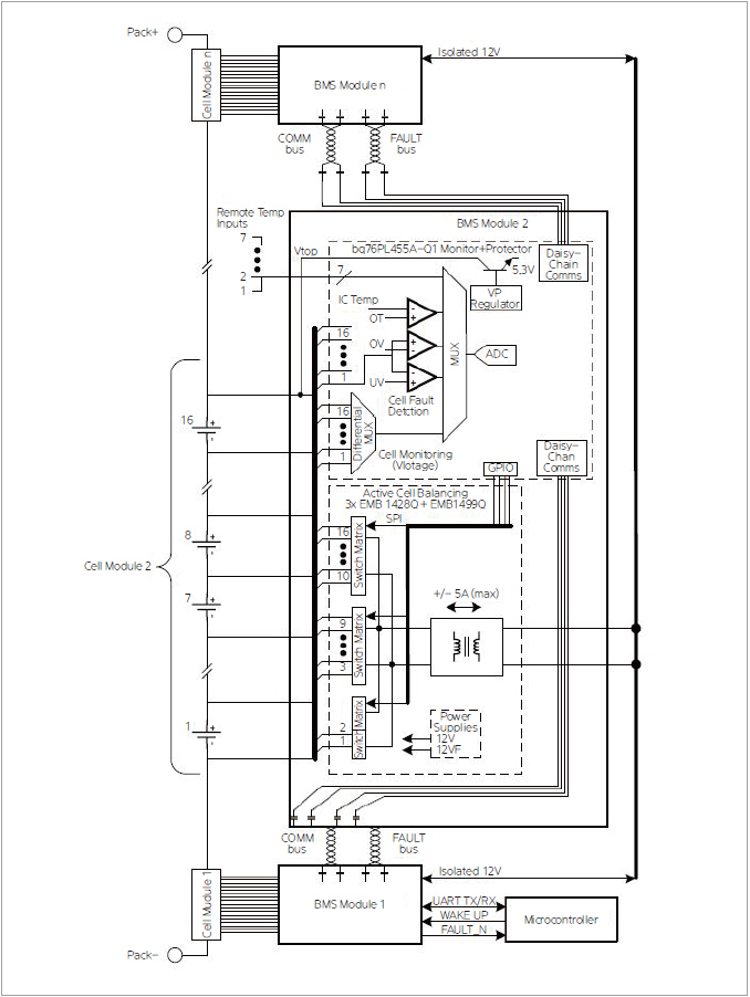 배터리 모니터링 집적회로(BMIC) 또는 셀 밸런서 디바이스는 한 모듈 내 배터리 셀 각각의 전압과 그 모듈 내 여러 지점의 온도, 그 밖의 상태를 모니터링 하기 위해 배치된다. 이 데이터는 셀 관리 컨트롤러(CMC)로 보고되고, 시스템의 복잡도에 따라 더 높은 차원의 프로세싱 구성요소, 예를 들어 한 개 이상의 배터리 관리 컨트롤러(BMC)로 보고된다. 이러한 측정의 정밀성과 BMIC에서 CMC 및 BMC로의 통신 빈도는 우려되는 상황을 조기에 감지하여 위험해지기 전에 이를 바로잡는 것이 중요하다. 예를 들어, BMC는 회생 충전을 중단시키거나 팩의 전력 드로우를 감소시켜 개별적인 셀의 온도를 적정 범위로 되돌릴 수도 있고, 또는 차량의 운전자에게 대시보드의 “엔진 체크 요망” 라이트를 통해 이와 같은 상태를 경고할 수도 있다. 어떤 경우이든 BMIC는 매우 정밀한 측정을 할 수 있어야 하고 CMC와 견고한 통신을 할 수 있어야 한다. 그래야 BMC가 올바른 교정 조치를 제때 취할 수 있다. 전기 노이즈가 주변에 아주 많기 때문에, 효과적인 통신 네트워크를 설계해야 한다는 점에서 EV는 사실상 매우 까다롭다.