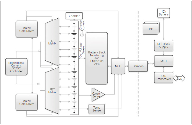 EV 배터리 팩은 복수의 셀 모듈이 직렬과 병렬로 구성된다. 차량 전체에 걸친 배터리 팩 중심으로 배열된 배터리 관리 시스템(BMS)은 여러 개의 컴포넌트로 구성되며, 배터리 셀 근처에 있는 모니터링 컴포넌트, 차량이 요구하는 바에 영향을 받는 하나 이상의 전력 변환 스테이지, 지능형 컨트롤러, 임베디드 프로세서 등이 있다. 아키텍처 내 전략적인 장소에 자리를 잡고 전력 서브시스템의 여러 가지 요소를 관리한다.