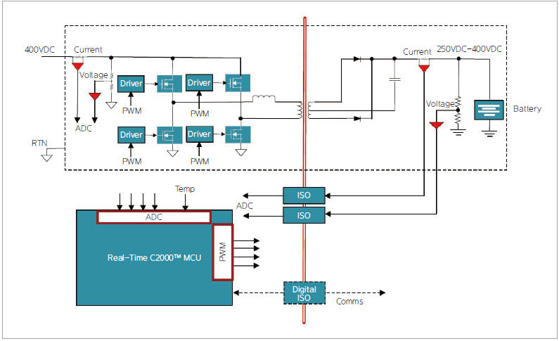 온보드 충전기 같은 배터리 충전 모듈을 설계할 때는 DSP 코어와 특수 코프로세서, 하드웨어 기반 가속기를 가진 고차원의 마이크로컨트롤러를 배치해야 온보드 충전 입력 전류와 중간 DC 버스 전압, 배터리 충전 전류, 배터리 터미널 전압 등 폐회로 제어에 관한 특별한 실시간 작동 요건들을 충족할 수 있다. 이러한 제어 회로에는 PID 컨트롤러나 2극 2제로 보상기 같은 계산 집약적인 알고리듬이 필요하다. 특별한 명령 세트를 실행하고 특수한 삼각 수학 연산을 지원하는 DSP 코어를 가진 MCU는 이러한 알고리듬에 필요한 프로세서 사이클의 수를 크게 줄여줄 수 있다. 예를 들어, RISC 코어가 수리 집약적인 사인 연산이나 코사인 연산을 완료하는데 60사이클이 필요하다면, DSP 코어는 같은 결과를 2사이클이나 3사이클 안에 해낼 수 있다. 또한 이러한 마이크로컨트롤러는 복수의 전력 토폴로지를 지원하고, 전압, 전류 등 시스템 파라미터에 관한 복수의 제어 루프를 지원할 수 있으며, 배터리 특성 변화에서 “누락”되는 것을 줄일 수 있을 만큼 성능도 뛰어나다.
