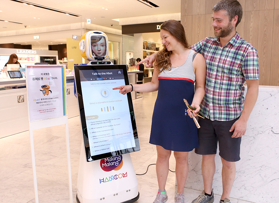 현대백화점을 통해 유통업계 최초로 선보이게 된 ’쇼핑봇‘은 한국어 기반 음성인식 통역 소프트웨어인 ’한컴 말랑말랑 지니톡‘이 탑재돼 외국인 쇼핑객들에게 통역 서비스를 제공한다.