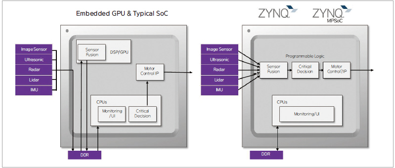 임베디드 비전 시스템은 일반적으로 올 프로그래머블(All Programmable) 징크-7000(Zynq®-7000)이나 징크 울트라스케일+(UltraScale+™) MPSoC 디바이스를 이용해 이미지 프로세싱 파이프라인을 구현한다. 이러한 제품들이 기존 임베디드 비전 애플리케이션에서 유의미했었다면, 임베디드 비전 융합 애플리케이션에서도 우수성을 확인할 수 있다. 프로세스 시스템과 프로그래머블 로직을 긴밀하게 결합함으로써 병목현상을 제거하고, 기존 CPU/GPU 기반 구현방식에서 발생하는 지연시간을 줄이고, 결정론을 간소화할 수 있다. 또한 프로그래머블 로직 IO 구조의 유연한 특성은 이미지 센서 및 RADAR, LIDAR 등과 같은 고대역폭 인터페이스와의 모든 연결을 가능하게 해준다.