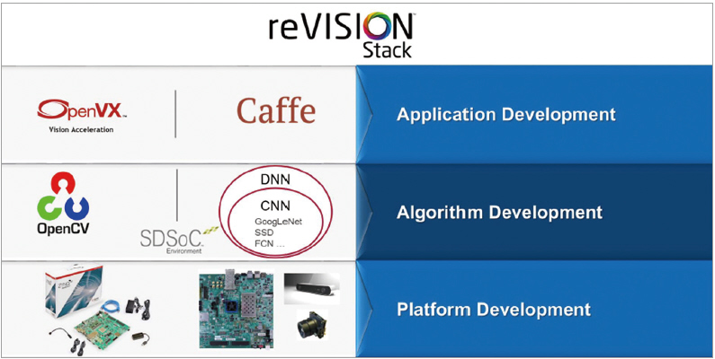 이 스택의 알고리즘 및 애플리케이션 레벨은 전통적인 이미지 프로세싱 플로우와 머신 러닝 플로우를 모두 지원할 수 있도록 설계되었다. 알고리즘 레이어에서는 OpenCV 라이브러리를 사용하여 이미지 프로세싱 알고리즘 개발할 수 있는 기능이 지원된다. 또한 상당 수의 OpenCV 기능(OpenCV 코어 서브셋 포함)을 프로그래머블 로직을 통해 가속화할 수 있는 기능이 포함되어 있다. 머신 러닝을 지원하는 알고리즘 개발 레이어는 머신 러닝 추론 엔진을 구현하기 위해 프로그래머블 로직 내에 배치할 수 있는 사전 정의된 여러 하드웨어 기능을 제공한다. 이러한 이미지 프로세싱 알고리즘 및 머신 러닝 추론 엔진은 최종 애플리케이션을 구현하기 위해 애플리케이션 레이어에서 액세스 및 사용이 가능하며, OpenVX 및 Caffe와 같은 하이-레벨 프레임워크를 지원한다.