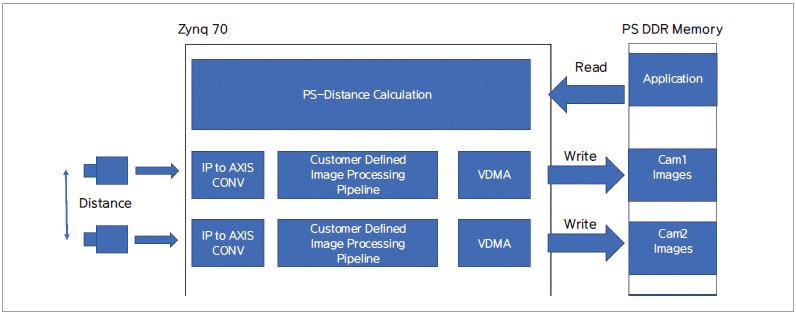 위에서 제시한 동종 접근방식의 아키텍처는 주로 이용 가능한 IP 블록을 기반으로 한 두 개의 이미지 프로세싱 체인을 보여준다. 이미지 데이터는 맞춤형 센서 인터페이스 IP 모듈을 이용해 캡처되며, 병렬 포맷에서 스트리밍 AXI로 변환된다. 이를 통해 쉽게 확장 가능한 이미지 프로세싱 체인을 구현할 수 있으며, 비디오 DMA와 결합된 고성능 AXI 인터커넥트를 이용해 이미지 프로세싱 체인에서 프로세서 시스템 DDR로 결과를 전송할 수 있다.