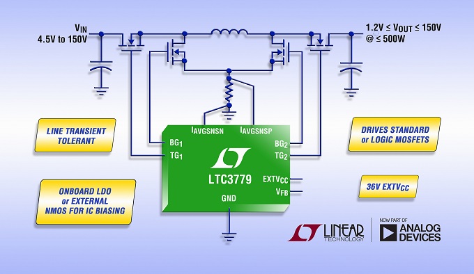아나로그디바이스는 입력 전압이 조정 출력 전압보다 낮거나 높거나 또는 동일한 입력 전압에서 동작하는 고효율(최대 99%) 4-스위치 단일 인덕터 동기식 벅-부스트 DC/DC 컨트롤러 신제품 'LTC3779'를 출시했다. 높은 입력 전압 소스나 높은 입력 서지에서 동작할 수 있도록 4.5V~150V의 입력 전압 범위를 갖도록 설계되었기 때문에 외부에 별도의 서지 억제 디바이스를 사용할 필요가 없는 것이 특징이며 교통, 산업, 군용 애플리케이션에 적합하다.