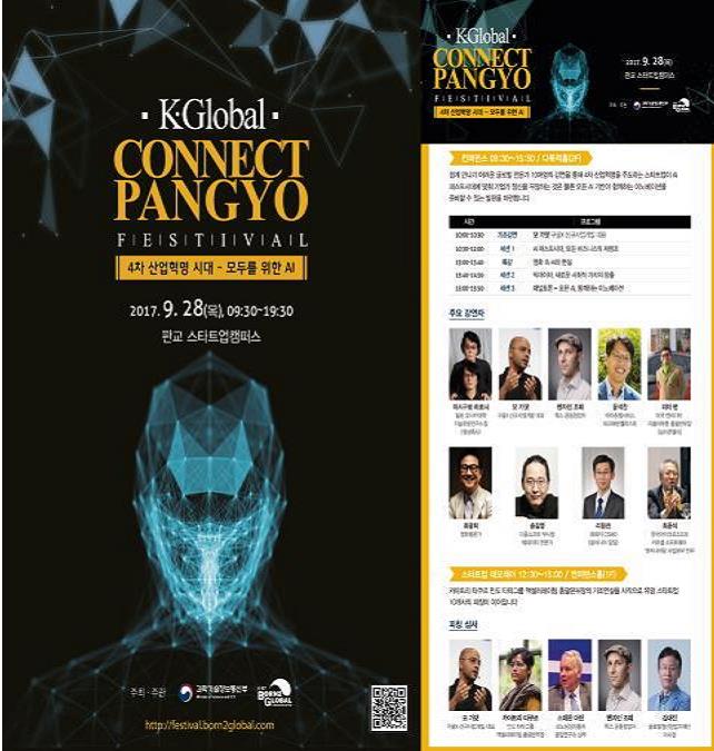 과학기술정보통신부(이하 ‘과기정통부’)는 국내 정보통신기술(ICT) 유망기업과 글로벌 기업들이 한자리에 모여 글로벌 시장 트렌드를 공유하고 비즈니스 네트워킹을 펼치는 ‘K-Global Connect 판교 페스티벌 2017’을 9월 28일 판교 스타트업캠퍼스에서 개최한다고 밝혔다.